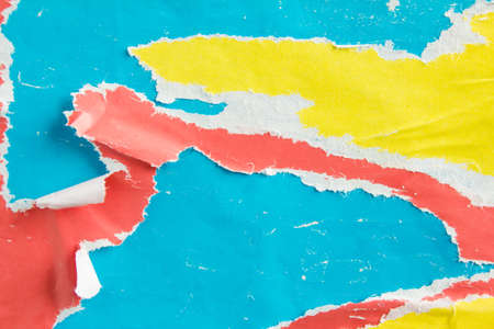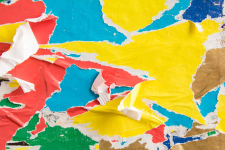 Red, yellow and blue torn, crumpled and peeling paper placards and posters on street wall billboard with rough surface texture background.