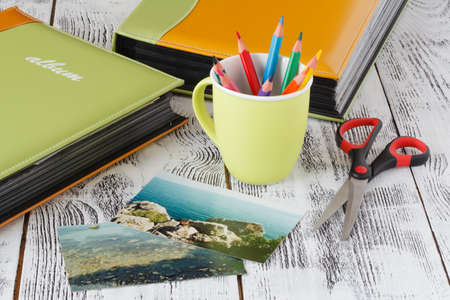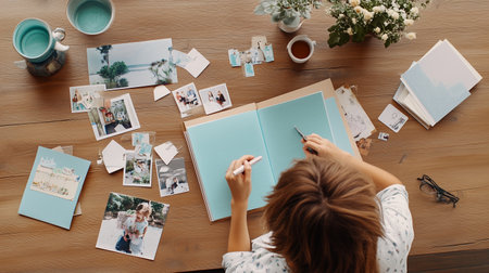 Creating a personalized scrapbook with photos and decorations on a wooden table at home during the afternoon