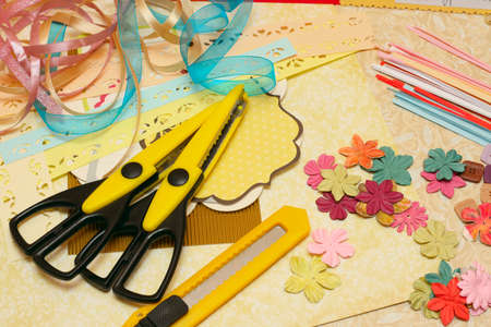 scrapbook background. Card and tools with decoration