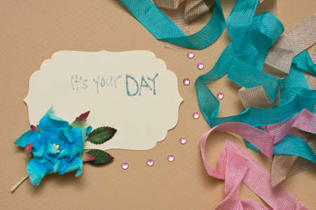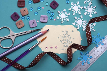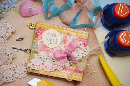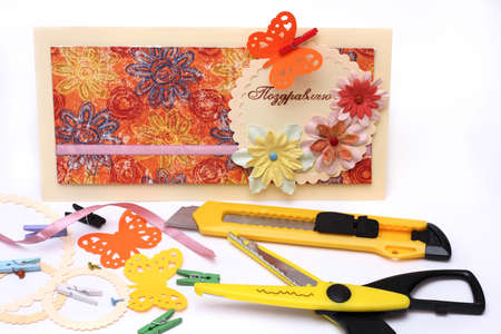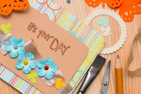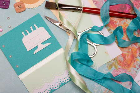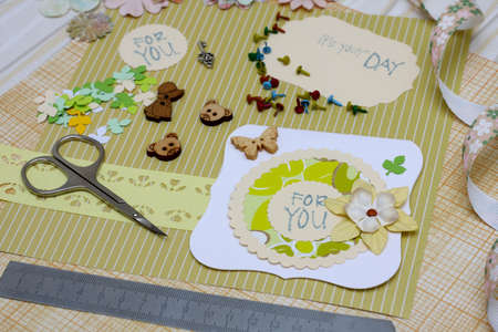 scrapbook background. process of creating a postcard - Card and tools with decoration