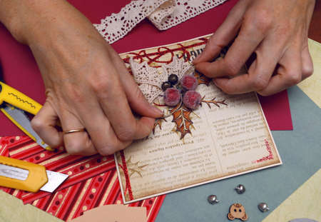 Hands of a woman crafting and scrap-booking christmas cards