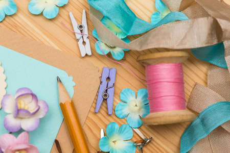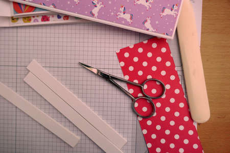 Top view of table with elements for scrapbooking, tools for decoration and handmade albums and cards. Craft materials. hobby