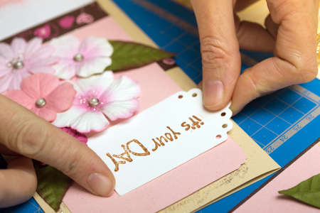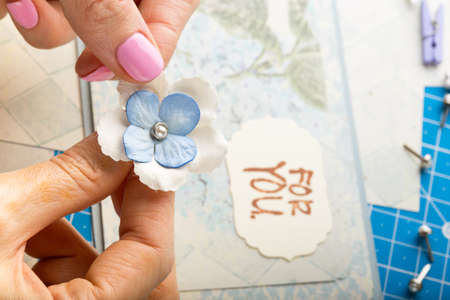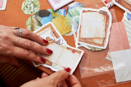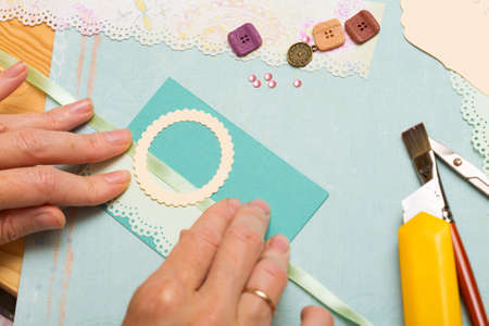 scrapbook background. Card and tools with decoration. Hands