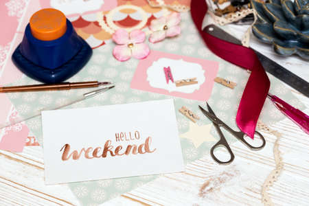 scrapbook background. hello weekend - process of creating a postcard. Card and tools with decoration