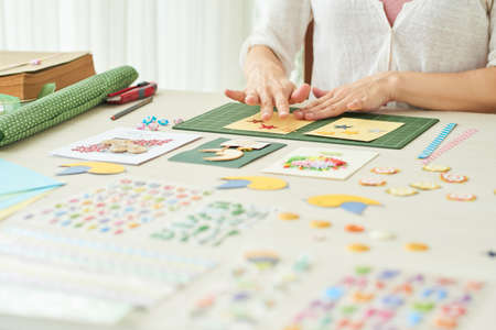 Close-up shot of unrecognizable woman wrapped up in making decoration for handmade greeting card while sitting at wooden table