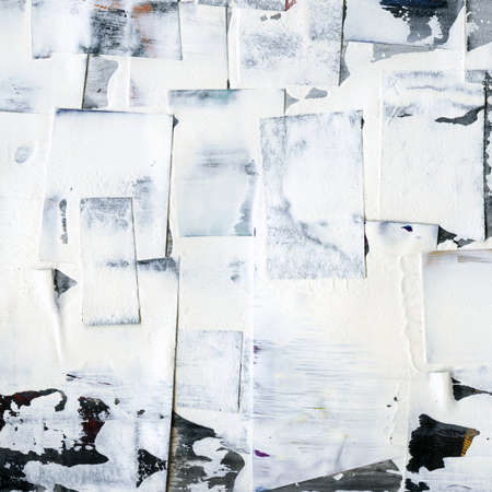 Old white grunge ripped torn collage posters creased crumpled paper placard texture background with copy space for text or image