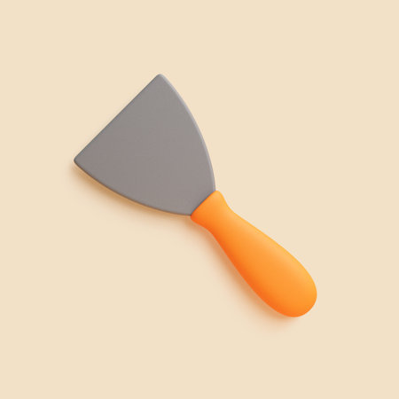 3D illustration of a gray putty knife with an orange handle viewed from above on a beige background