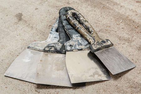 Two trowels wide and medium standing on a concrete floor against a plaster wall. Room renovation concept