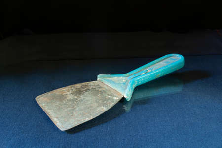 An old construction trowel is lying on the table with a reflection. Working tool on a black background