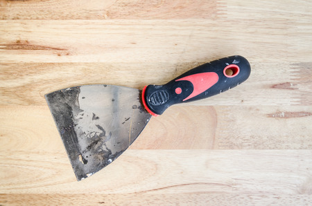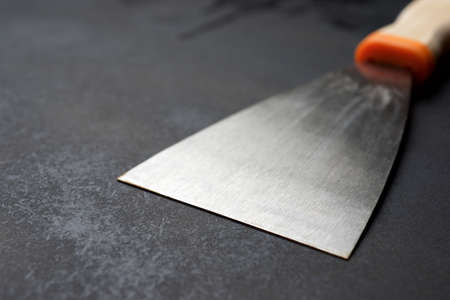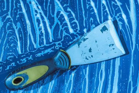 Construction dirty spatula. Spatula stained with cement. Repair in the apartment. Selective focus, grain