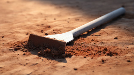 shovel resting on sandy area with soft-focus technique, showcasing light orange and light maroon colors. the tactile and eroded surfaces add depth to the image. this captivating photo, featuring a contest-winning composition, incorporates the sfumato technique and various shades of brown. ai generated