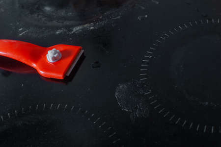 Scraper for cleaning glass ceramics against the background of a plate with burnt dirt.