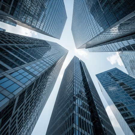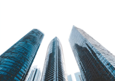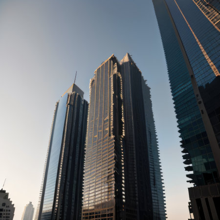 High-angle perspective captures a cluster of towering skyscrapers. The buildings ascend towards a clear blue sky, demonstrating a modern architectural style. The composition includes visual elements that suggest an urban setting, the scene being bathed in natural light. This arrangement creates a sense of scale.