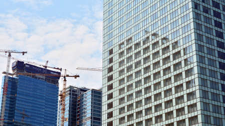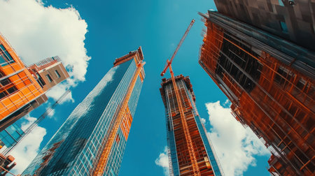 Skyscraper construction site with cranes and workers against a bright blue sky