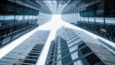 An upward perspective captures a cluster of towering skyscrapers. The buildings exhibit a symmetrical arrangement. The composition highlights the geometric lines. Ideal for visual representations, this image could be suitable for various commercial or editorial applications.