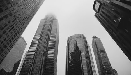 A low-angle shot looking up at the towering skyscrapers against a stark white sky