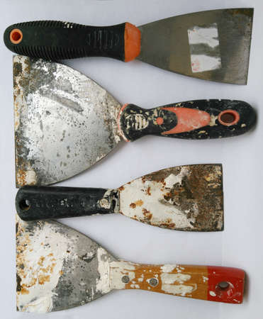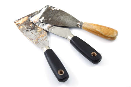 Three used putty knives on a white background.