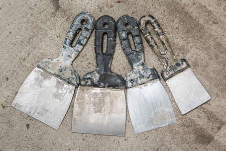 Dirty building spatulas on a gray concrete background. Close-up
