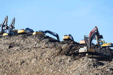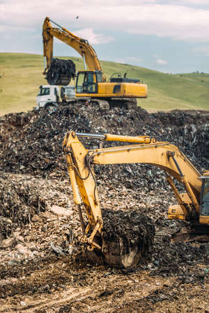 Close up of heavy duty excavators loading dumper trucks with garbage and urban trash