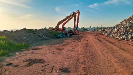 Garbage truck unloads construction waste from container at the landfill. Recycling waste concrete and demolition material. Recycling concrete and concrete debris. Wheel loader at processing plant