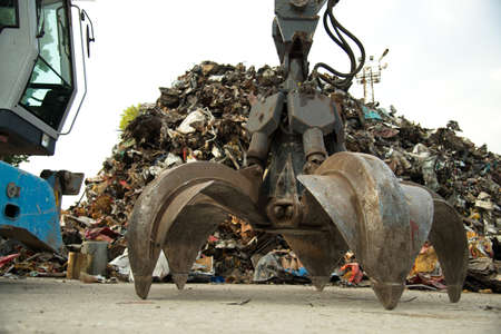 Close-up view on mechanical arm claw of crane at landfill.