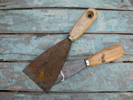 Kit of putty knives over wooden table