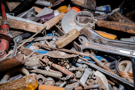 Old tools, rusted screws and metal scraps on a pile in a workshop