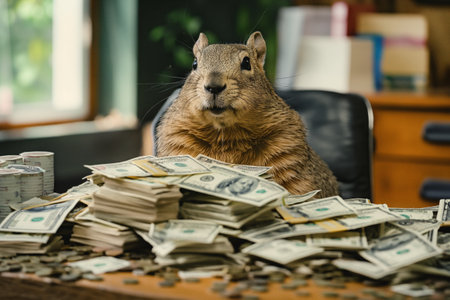 A comically large squirrel sitting atop a heap of dollar bills, suggesting a theme of unexpected wealth or savings.
