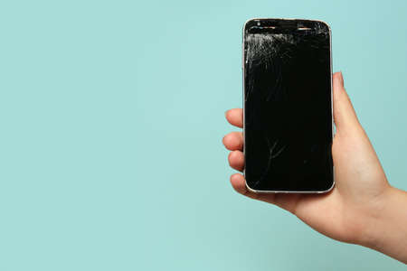 Man hand holding mobile phone with broken screen