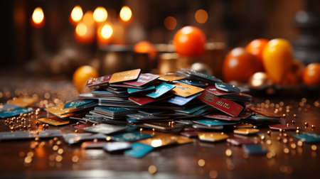 A stack of playing cards on a wooden table. The cards are red and white and are piled on top of each other. Concept of anticipation and excitement, as if someone is about to play a game of cards