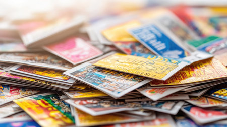 Close up view of green lottery scratch cards. Many used fake instant lottery tickets with gambling results. Gambling addiction concept.