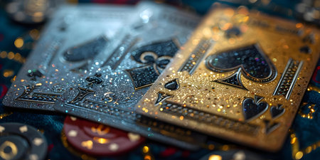 Closeup of metallic casino cards featuring black and red aces suitable for poker blackjack and baccarat. Concept Casino Cards, Closeup Photography, Black Aces, Red Aces, Poker Blackjack Baccarat
