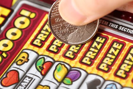 close up view of silver coin in hand of gambler scratching lottery ticket