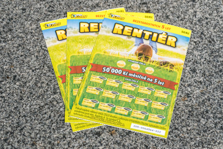 Prague, Czech Republic - July 10, 2020: Czech Rentier lottery scratch cards.
