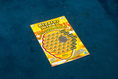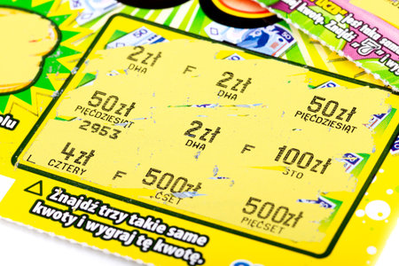 Cracow, Małopolska / Poland - circa January 2019: Scratch card from polish lotto, lottery ticket scratch-off scratchie with numbers. Gambling addiction, winning money lottery paper card coupon concept