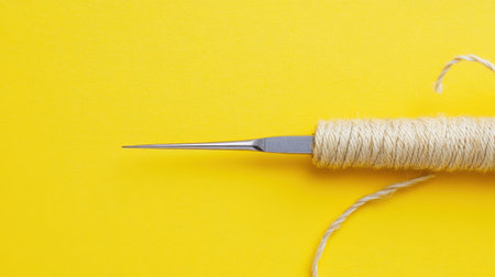 This image showcases a sewing needle elegantly wrapped in natural fiber twine, set against a bright yellow background. Perfect for crafting themes.