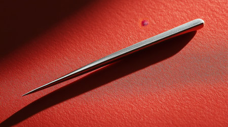 This close-up image features a metallic tweezer lying flat on a vivid red background, showcasing its sharp tip and unique texture with soft shadows.