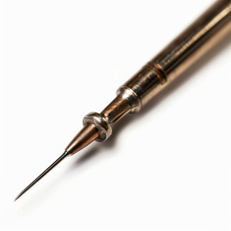 This close-up image captures a precision needle mounted on a syringe, highlighting its sharp detail and metallic finish against a softly blurred background.