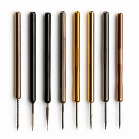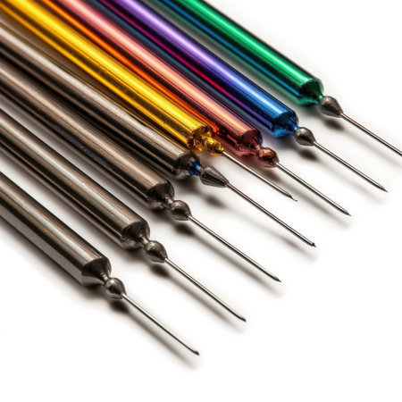 A captivating close-up of colorful precision needle tools lined up neatly, showcasing their unique properties ideal for various crafting and artistic projects in a studio.