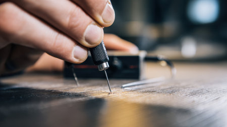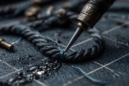 A close-up view of a jewelry-making process, featuring a detailed shot of a blue rope being looped with a piercing metal tool. the textured surface and scattered metallic elements highlight meticulous craftsmanship. Generative AI