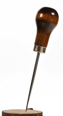 An awl with wooden handle on a white background with copy space