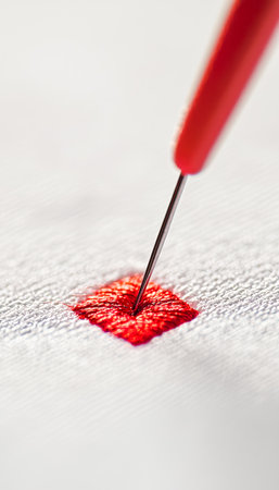 A fine needle with a vibrant red thread secures smooth white textile, highlighting craftsmanship and attention to detail in sewing artistry.