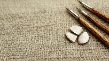 Collection of artist tools including metal shapes and wooden handles arranged on a natural fabric surface, ideal for showcasing creativity and craftsmanship.