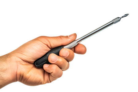 A hand firmly grasps a screwdriver, its metallic sheen contrasting with the smooth, pale skin. The background is stark white, creating a clean and minimalistic aesthetic.
