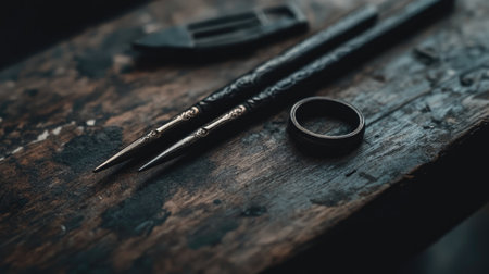 Close-up view of elegant writing tools and a stylish ring on a rustic wooden table, evoking a warm and creative atmosphere in a softly lit workshop.