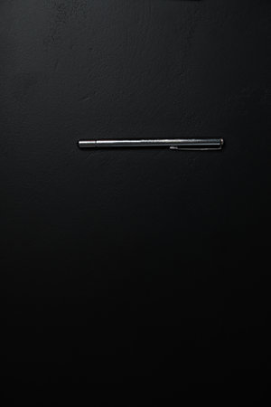 Silver pen on a black background. Vertical business concept with copy space. vertical layout with pen and banner, success story design.