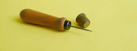 Sewing supplies. Awl and thimble close up on a yellow background. Banner