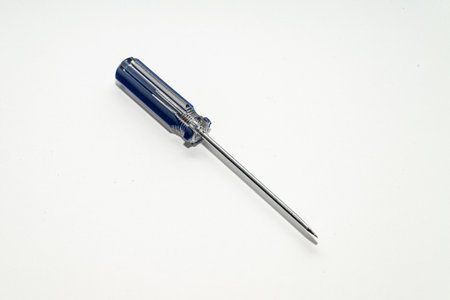 of a screwdriver with a blue handle on an isolated white background