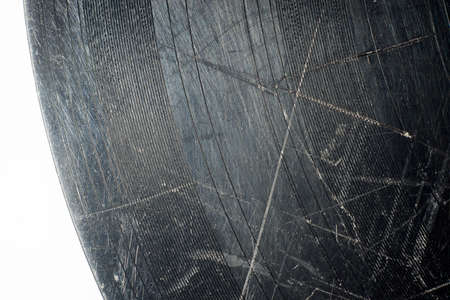 An extreme close-up of a dark metallic surface covered in numerous scratches, grime, and debris, revealing a rough and heavily textured appearance.