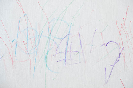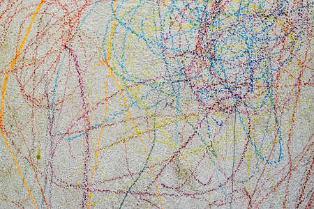 Child scribble on the wall colored pencils scribbles on a white wall made by a little kid that could pass as abstract work.